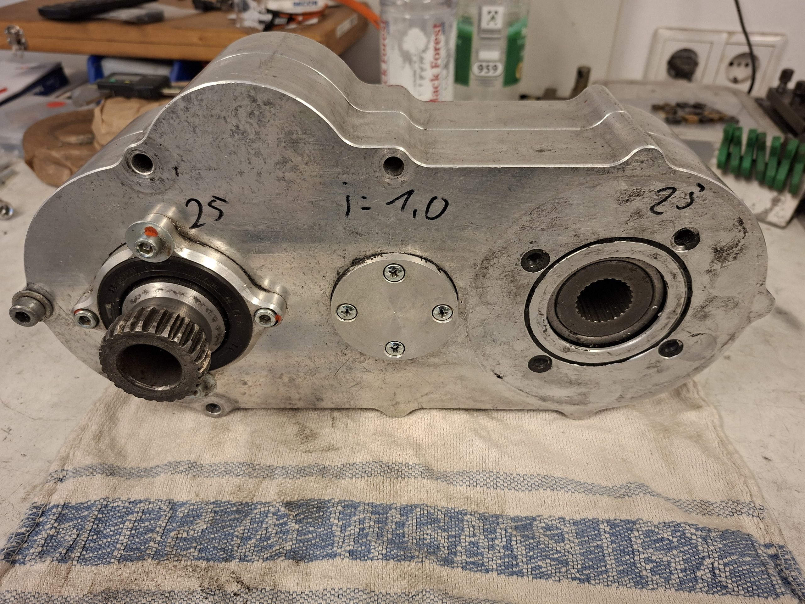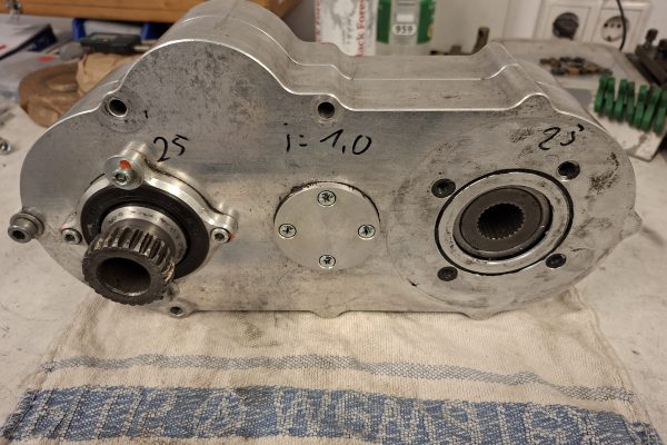 Das Getriebe hat die Übersetzung von 1,0 und ein Abstand von 200mm Eingang zur Ausgangswelle.