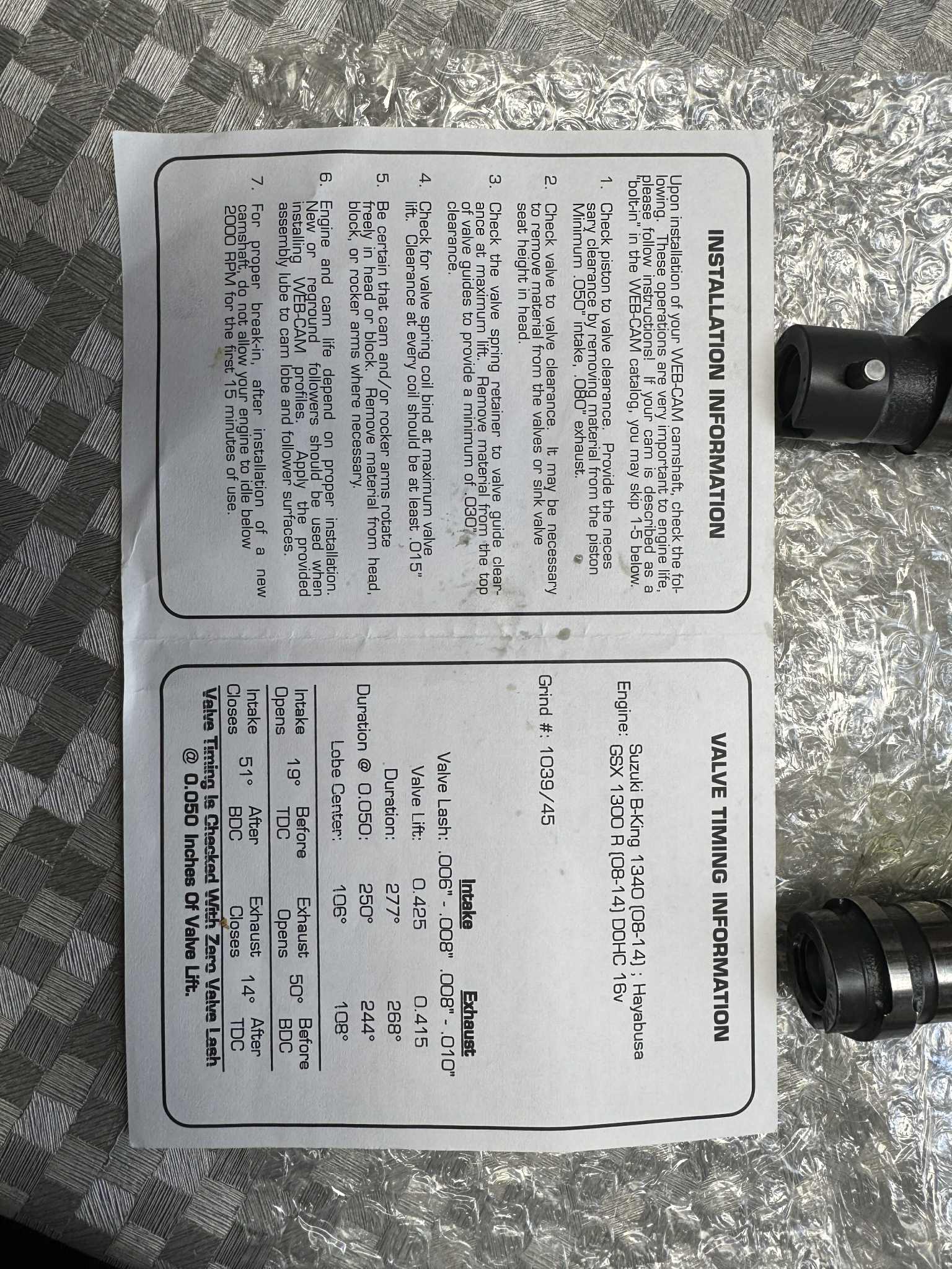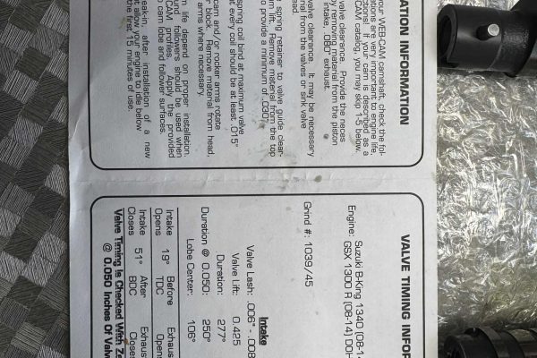 Te koop Hayabusa Web cams nokkenassen (specs zie foto)Versterkte klepveren (70psi)2 sets, oversize ferrera kleppen +1mm 6 inlaat en 6 uitlaat kleppen, oil adapterplate 2x